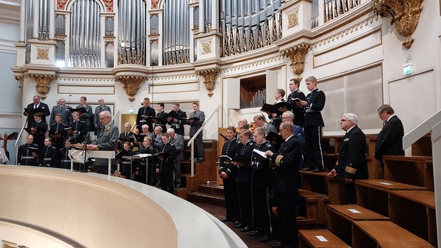 Kaaderilaulajat ja Kadettikuoro yhteiskuvassa MPKK:n jumalanpalveluksessa